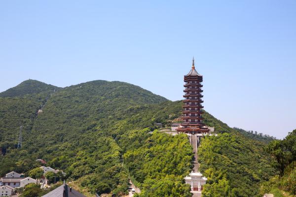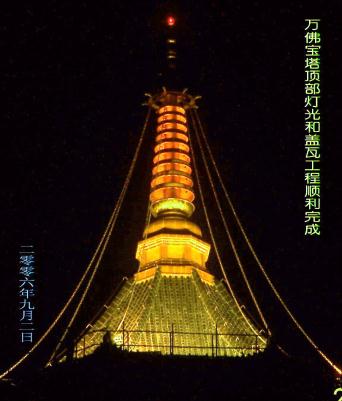 普陀山万佛宝塔工程,万佛宝塔背靠佛顶山主峰,建筑面积3194平方米,总高72.26米。该建筑巍峨雄伟,庄严秀美,整体布局独具匠心的公共建筑工程,它把古代建筑结构与现代建筑施工技术相融合,宝塔采用八角重檐楼阁式,蓝琉璃瓦攒尖顶,塔分九层十三檐,层高按每层等距缩进,形成宝塔整体空间变化的韵律美。