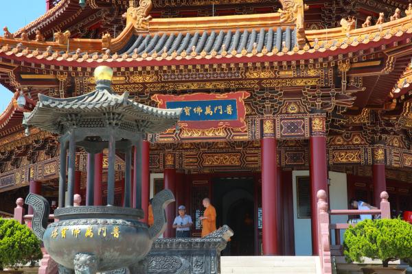 万佛宝塔为六角型,塔体内圆,造型简洁,比例适度,坚固朴实。它既不同于汉族传统的楼阁式宝塔,也不同于元代盛行的由印度传入我国的喇嘛塔(瓶型塔),可谓自成一体,别具一格。普陀山普门万佛宝塔是一座融合古建筑重建要求与现代,雄伟秀美,是四大佛教名山之一的海天佛国普陀山的又一重要宗教场所。